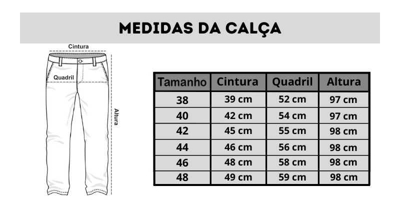 Observação: Os tamanhos podem sofrer variações mínimas devido ao processo de confecção.